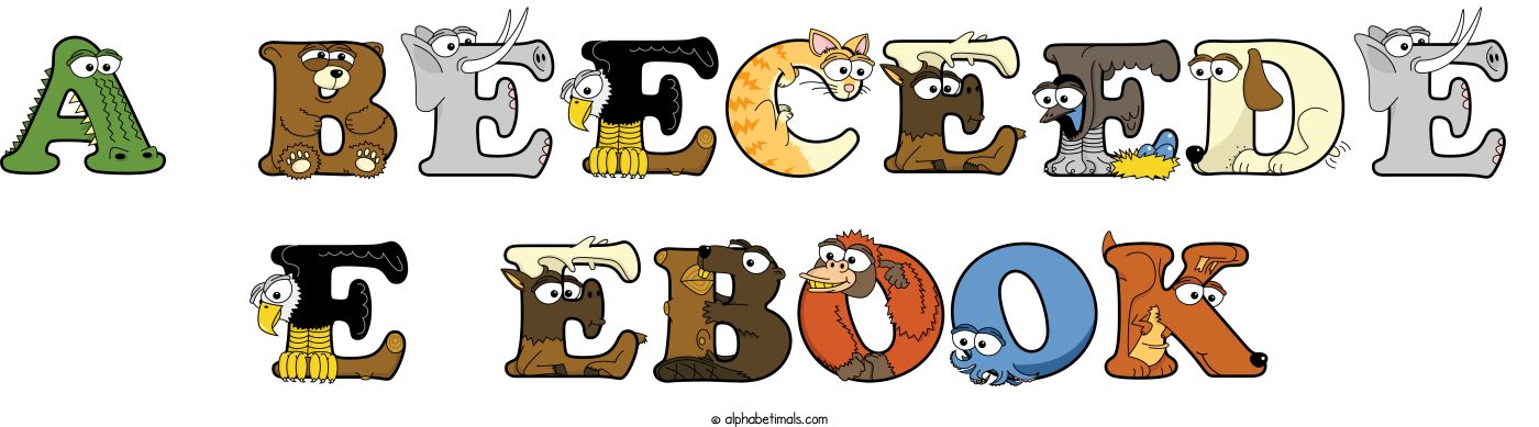 This word art spells A Beeceede E Ebook using cute cartoon animal alphabet letters.