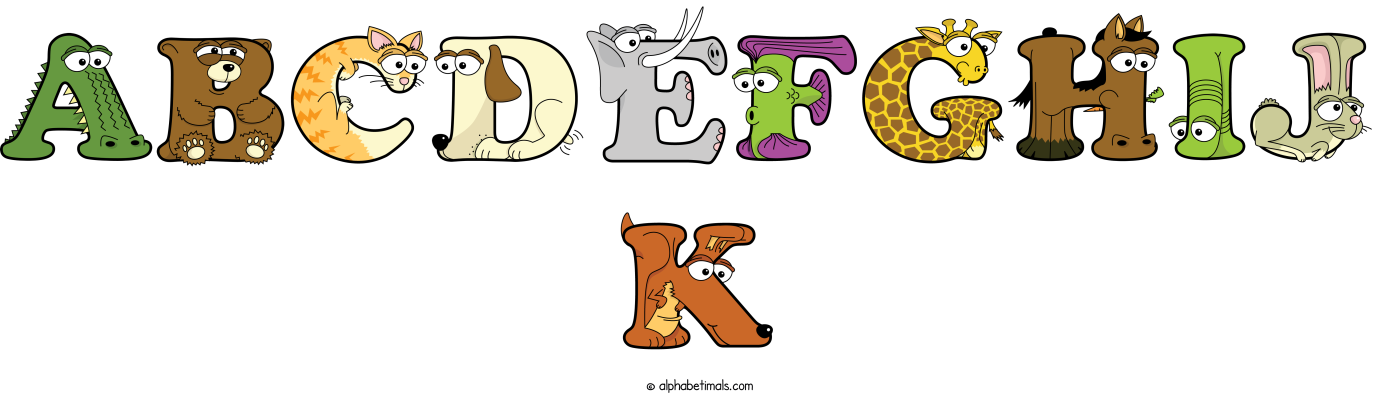 This word art spells abcdefghij-k using cute cartoon animal alphabet letters.