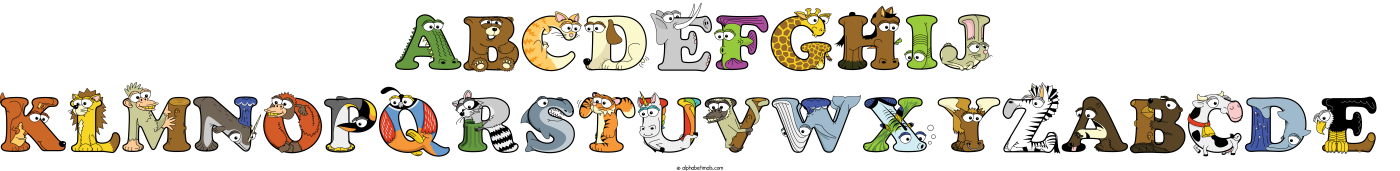 This word art spells Abcdefghij Klmnopqrstuvwxyzabcde using cute cartoon animal alphabet letters.