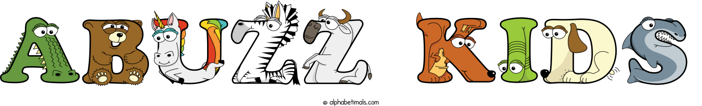 This word art spells Abuzz Kids using cute cartoon animal alphabet letters.