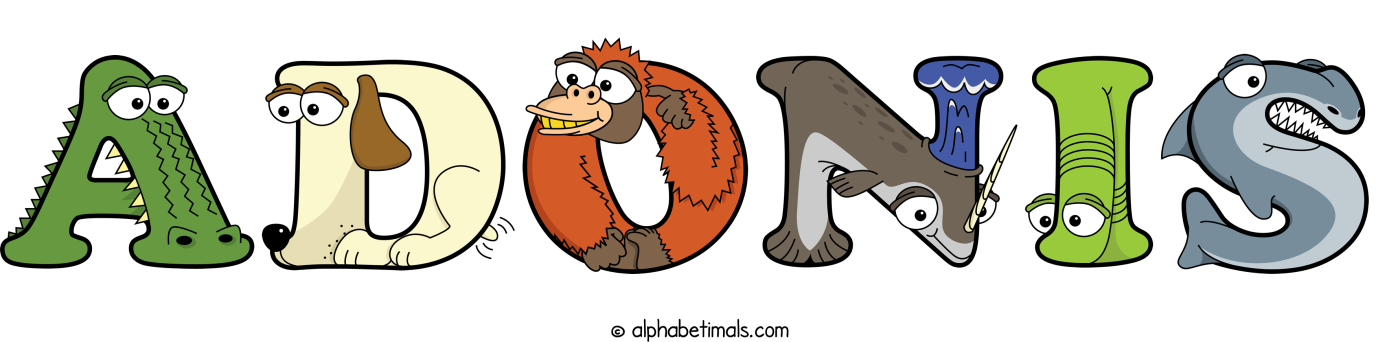 This word art spells Adonis using cute cartoon animal alphabet letters.