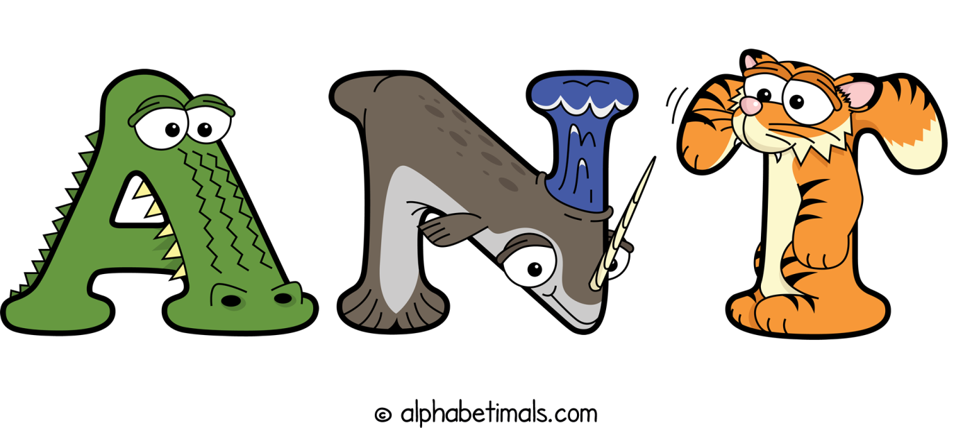 This word art spells Ant using cute cartoon animal alphabet letters.