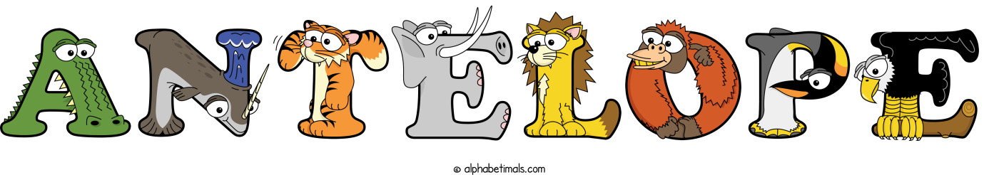 Antelope animal word art spelling Antelope with Alphabetimals - cartoon alphabet animals