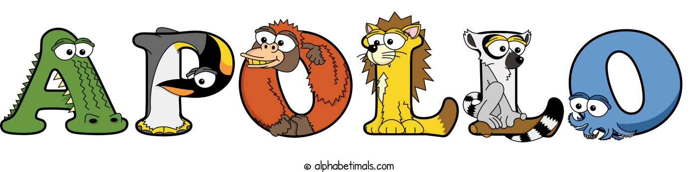 This word art spells Apollo using cute cartoon animal alphabet letters.