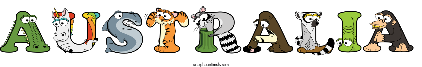 This word art spells Australia using cute cartoon animal alphabet letters.