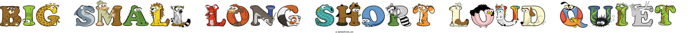 This word art spells Big Small Long Short Loud Quiet using cute cartoon animal alphabet letters.