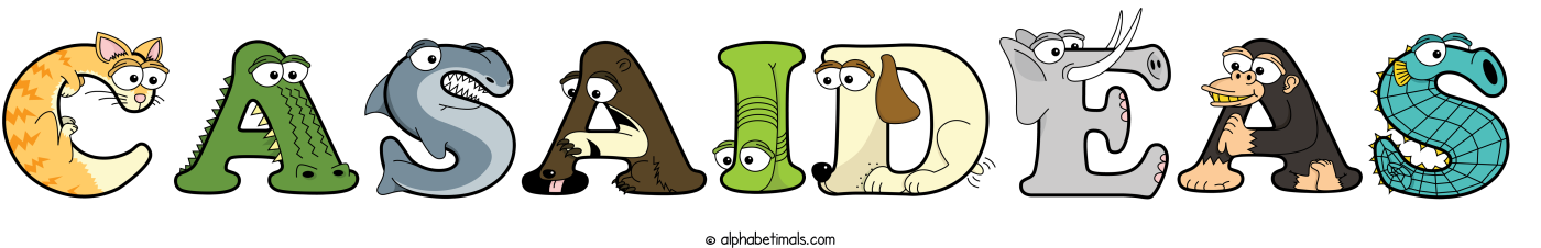 This word art spells Casaideas using cute cartoon animal alphabet letters.
