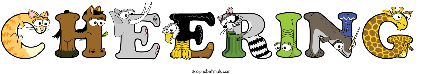 This word art spells Cheering using cute cartoon animal alphabet letters.