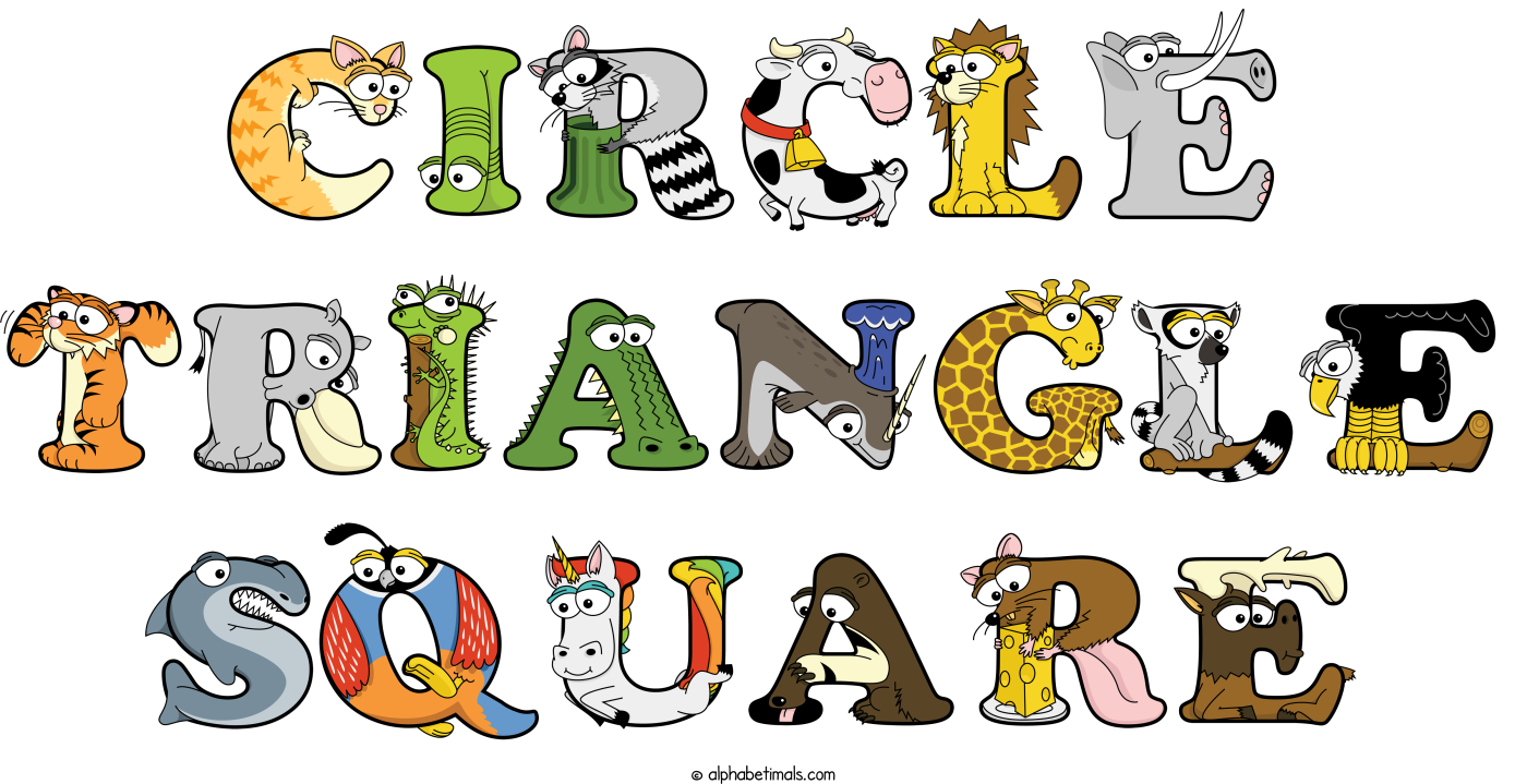 This word art spells Circle Triangle Square using cute cartoon animal alphabet letters.