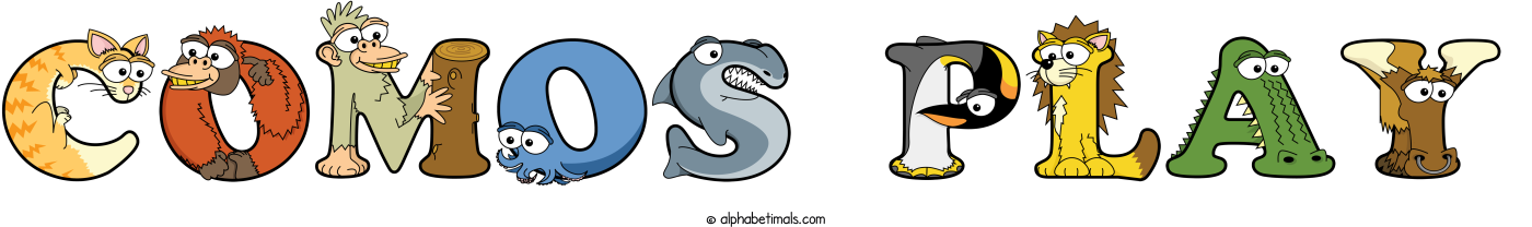 This word art spells Comos Play using cute cartoon animal alphabet letters.