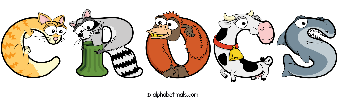 This word art spells Crocs using cute cartoon animal alphabet letters.