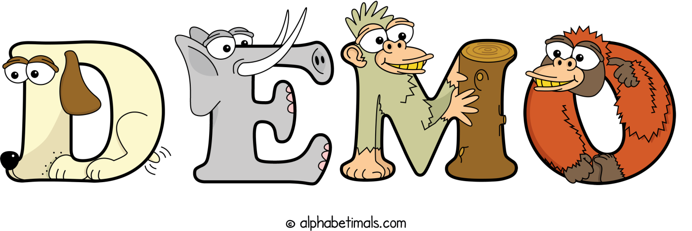 This word art spells Demo using cute cartoon animal alphabet letters.