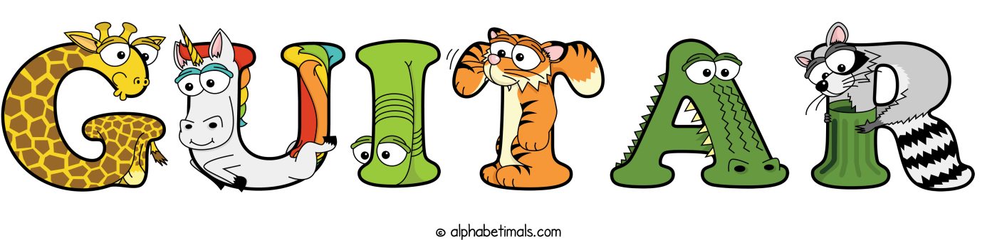 This word art spells Guitar using cute cartoon animal alphabet letters.