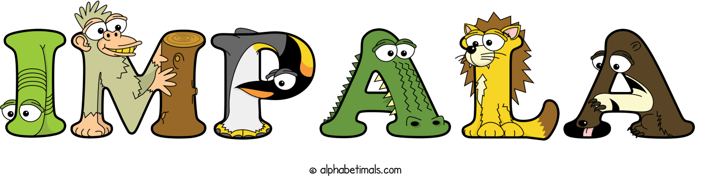 This word art spells Impala using cute cartoon animal alphabet letters.