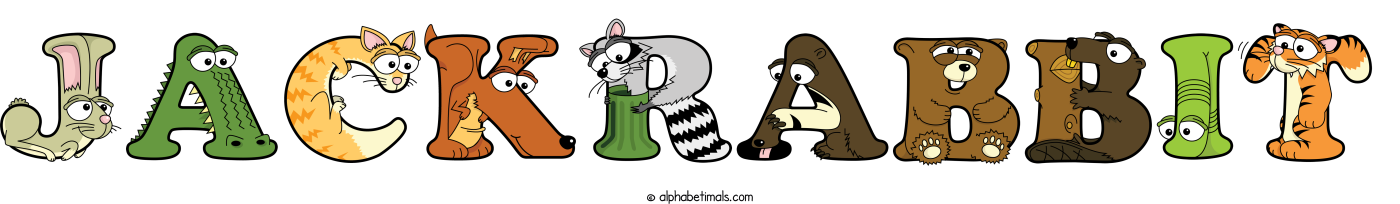 This word art spells Jackrabbit using cute cartoon animal alphabet letters.