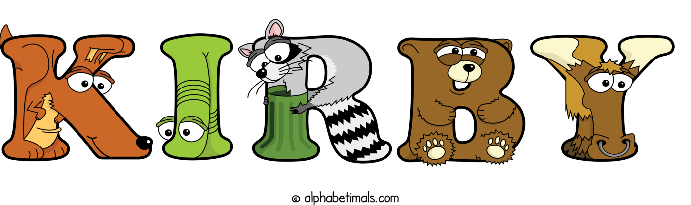 This word art spells Kirby using cute cartoon animal alphabet letters.
