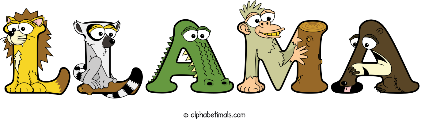 This word art spells Llama using cute cartoon animal alphabet letters.