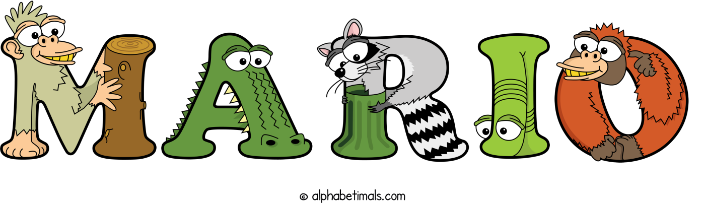 This word art spells Mario using cute cartoon animal alphabet letters.
