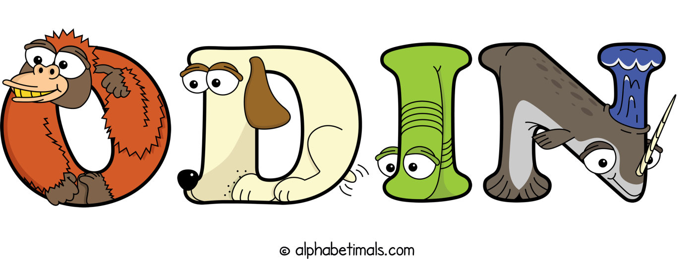 Odin animal word art spelling Odin with Alphabetimals - cartoon alphabet animals