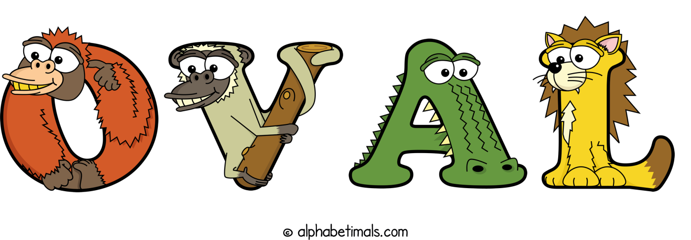 This word art spells Oval using cute cartoon animal alphabet letters.