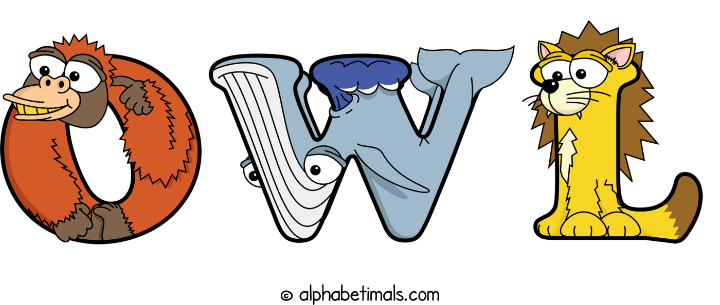 This word art spells Owl using cute cartoon animal alphabet letters.
