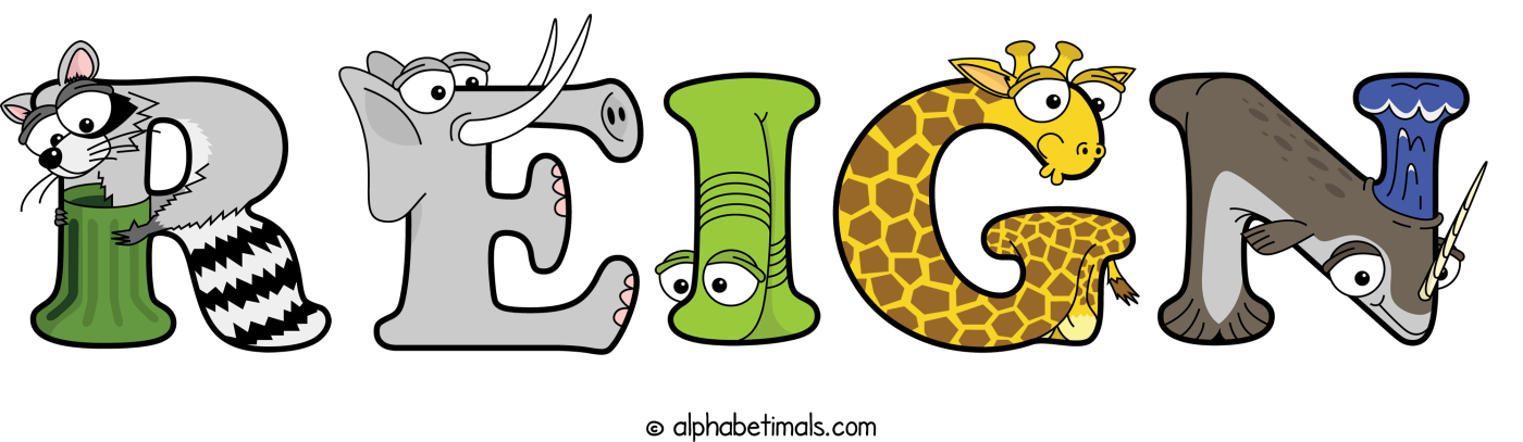 This word art spells Reign using cute cartoon animal alphabet letters.