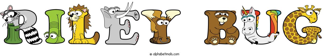 This word art spells Riley Bug using cute cartoon animal alphabet letters.