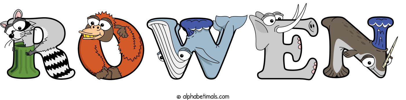 This word art spells rowen using cute cartoon animal alphabet letters.
