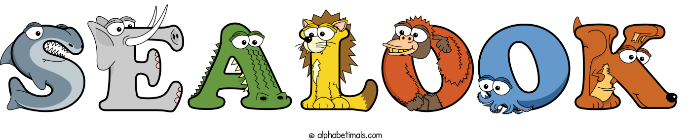 This word art spells Sealook using cute cartoon animal alphabet letters.