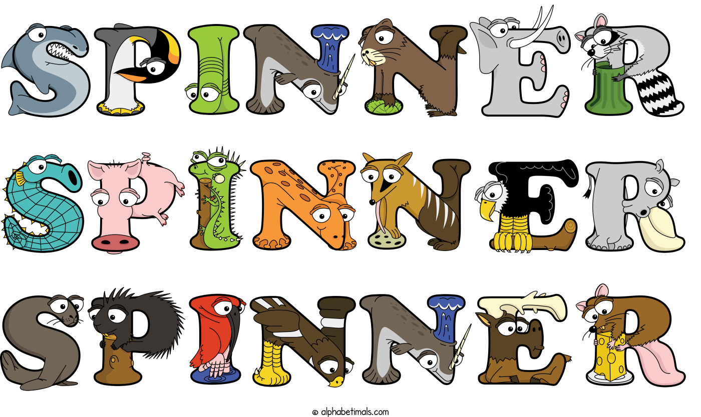 This word art spells Spinner Spinner Spinner using cute cartoon animal alphabet letters.