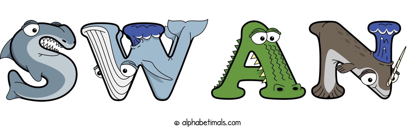 This word art spells Swan using cute cartoon animal alphabet letters.
