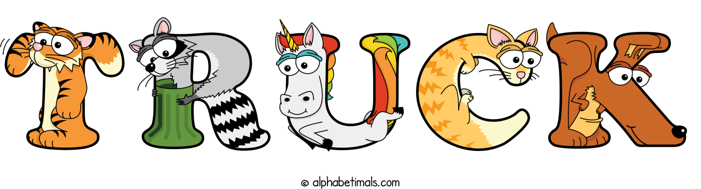 This word art spells Truck using cute cartoon animal alphabet letters.