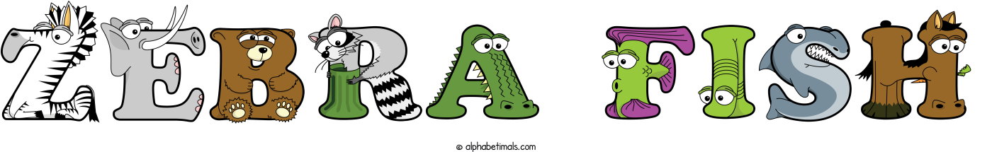 This word art spells Zebra Fish using cute cartoon animal alphabet letters.