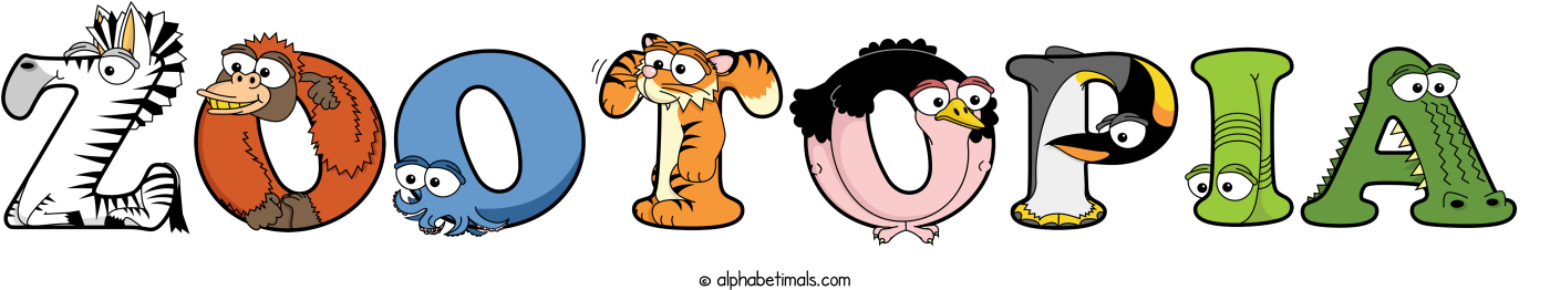 This word art spells Zootopia using cute cartoon animal alphabet letters.