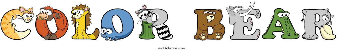This word art spells Color Bear using cute cartoon animal alphabet letters.