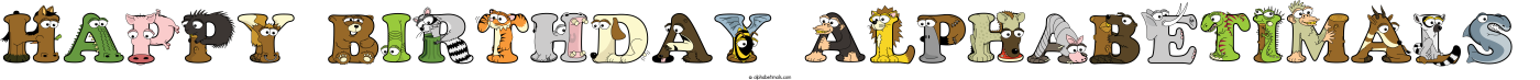 This word art spells Happy Birthday Alphabetimals using cute cartoon animal alphabet letters.