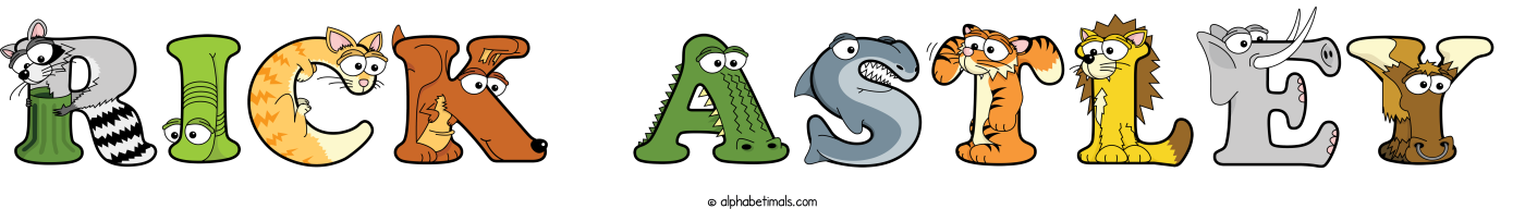 This word art spells Rick Astley using cute cartoon animal alphabet letters.