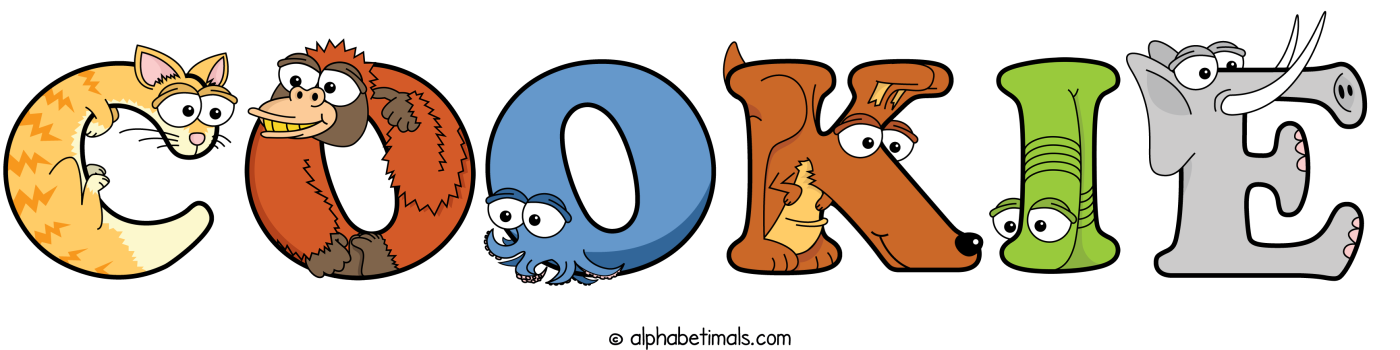 This word art spells Cookie using cute cartoon animal alphabet letters.