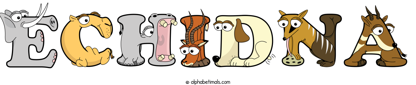 This word art spells Echidna using cute cartoon animal alphabet letters.