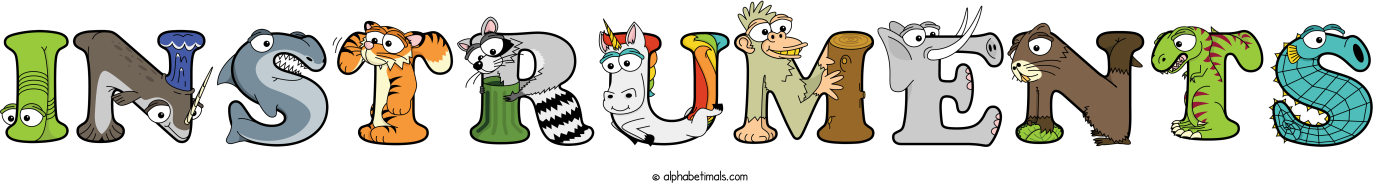 This word art spells Instruments using cute cartoon animal alphabet letters.