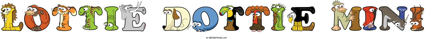 This word art spells Lottie Dottie Mini using cute cartoon animal alphabet letters.