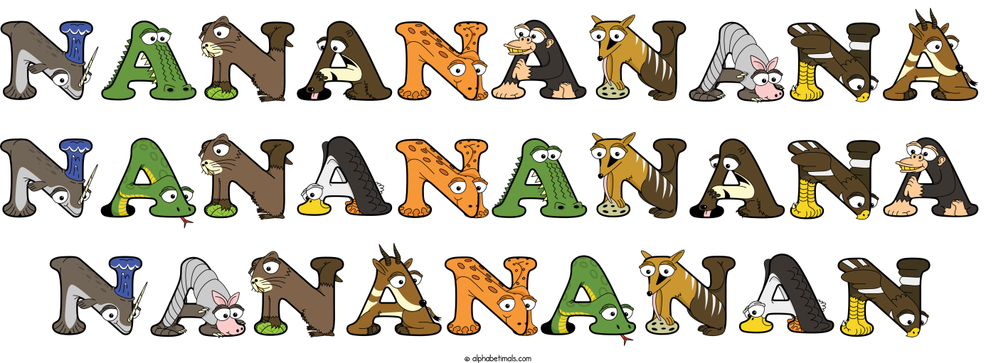 This word art spells Nanananana Nanananana Nanananan using cute cartoon animal alphabet letters.