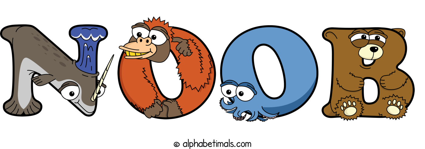 This word art spells Noob using cute cartoon animal alphabet letters.