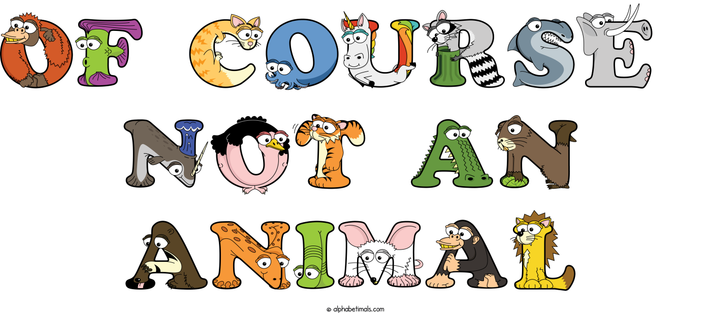 This word art spells Of Course Not An Animal using cute cartoon animal alphabet letters.