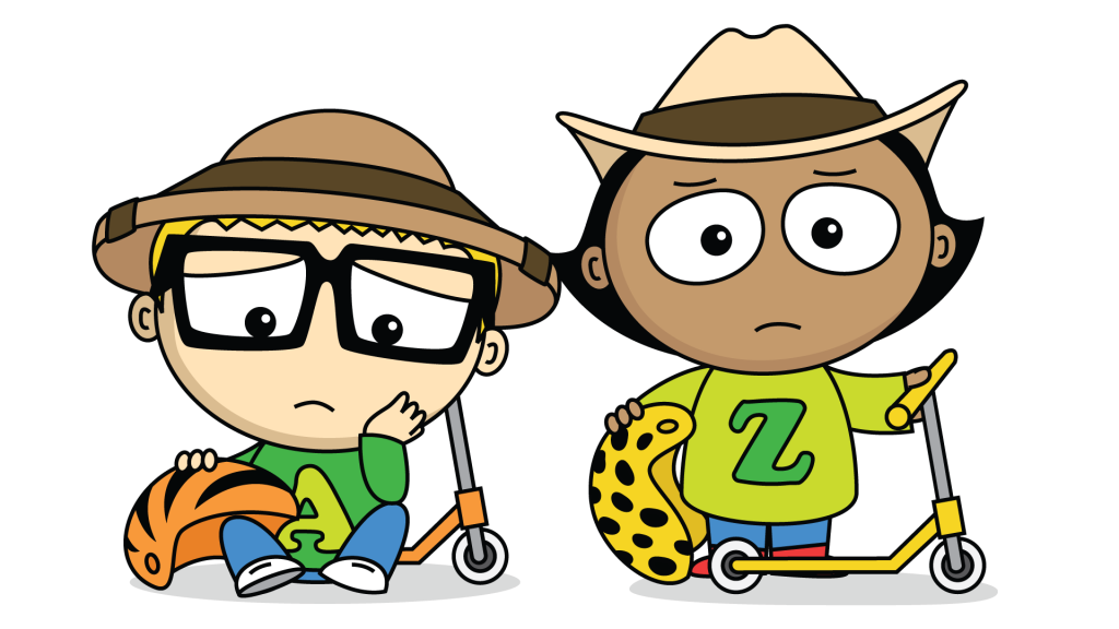 Albert and Zoe jumped on their scooters and zoomed around town looking for letters and animals.