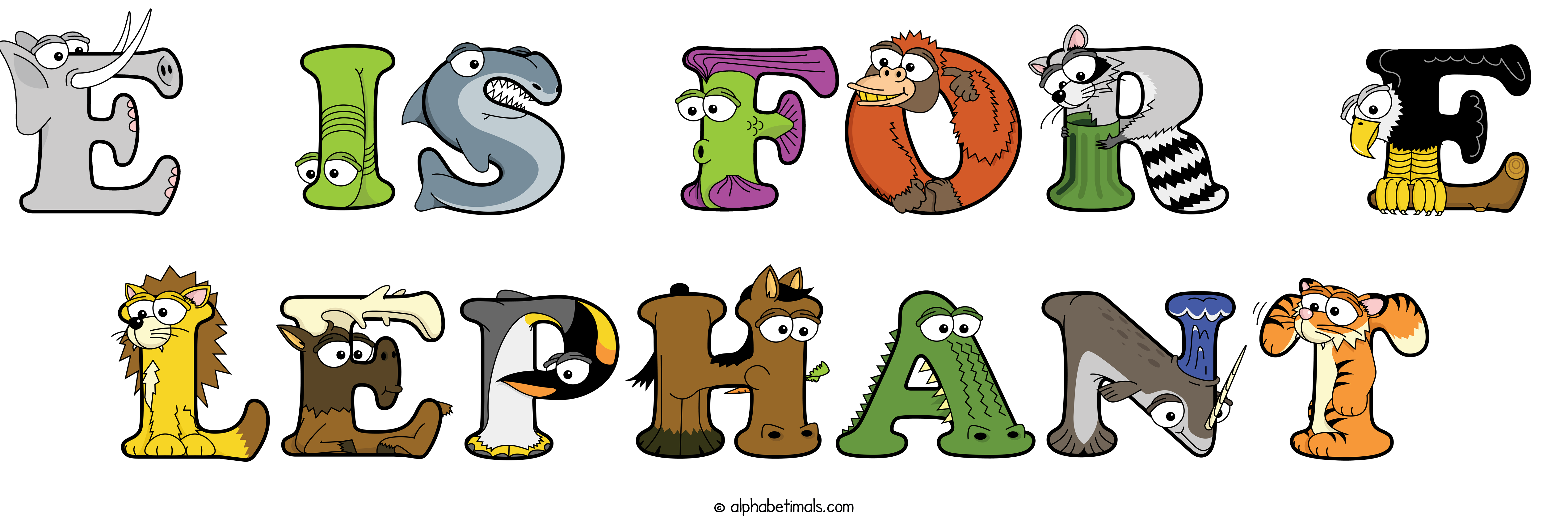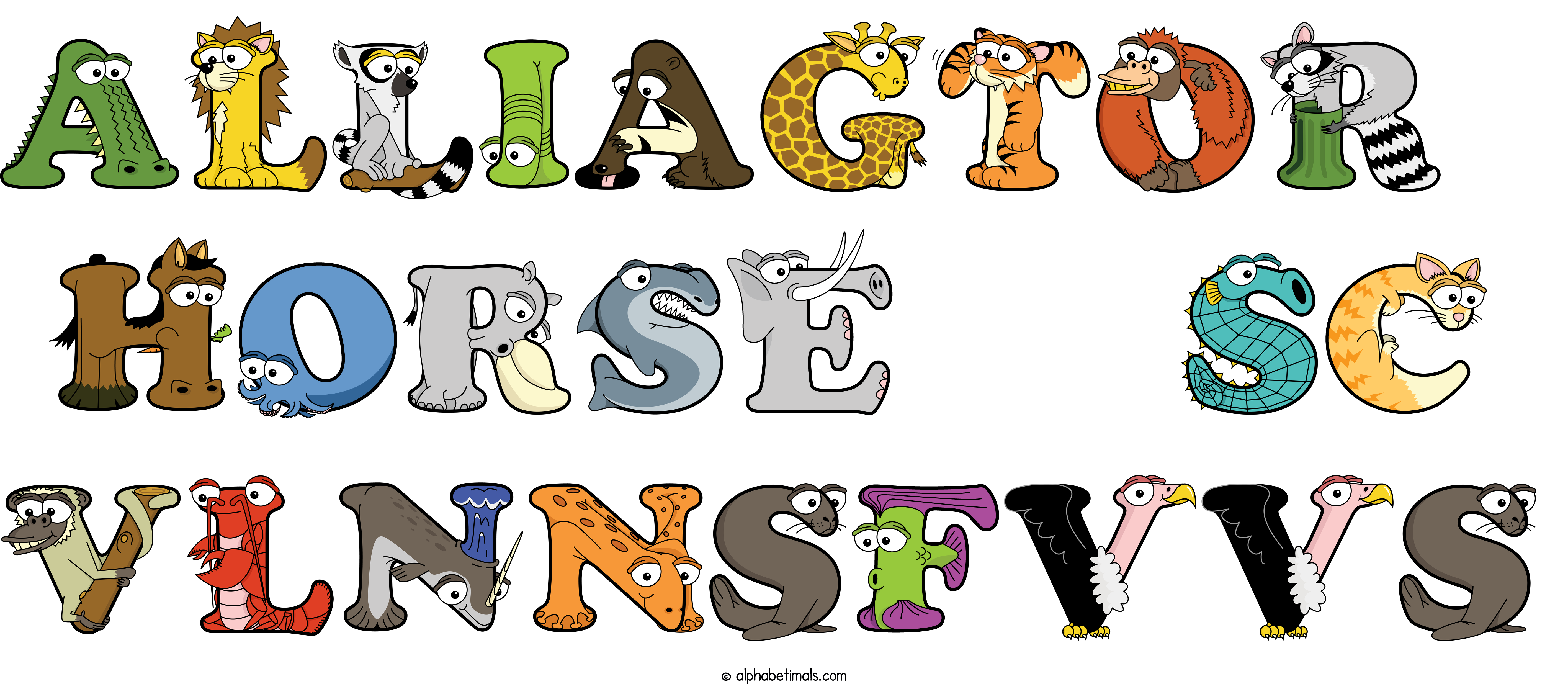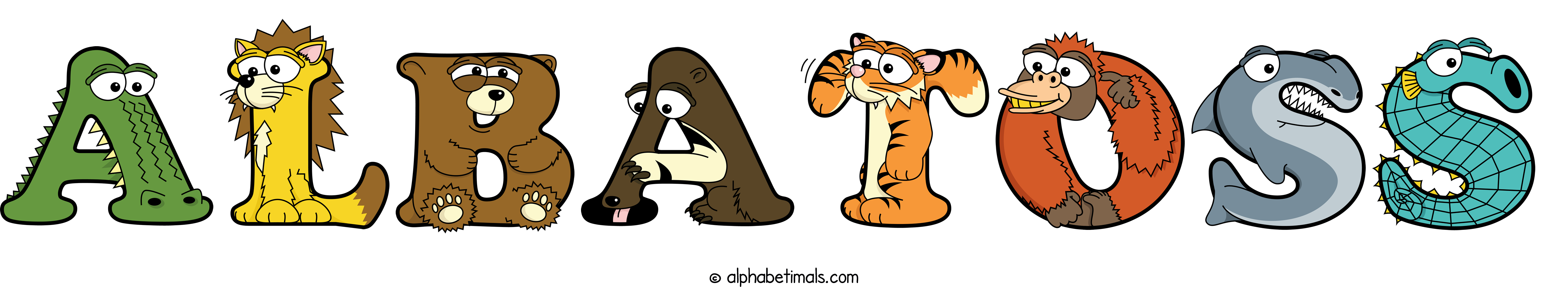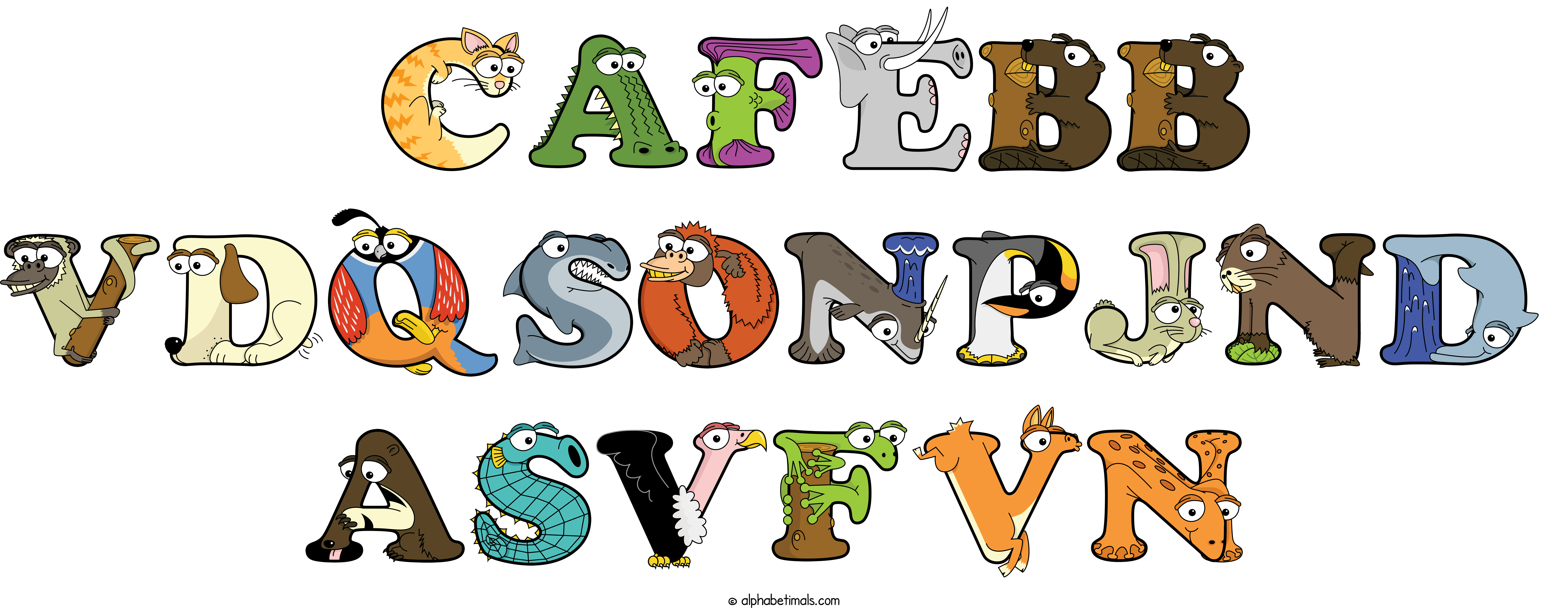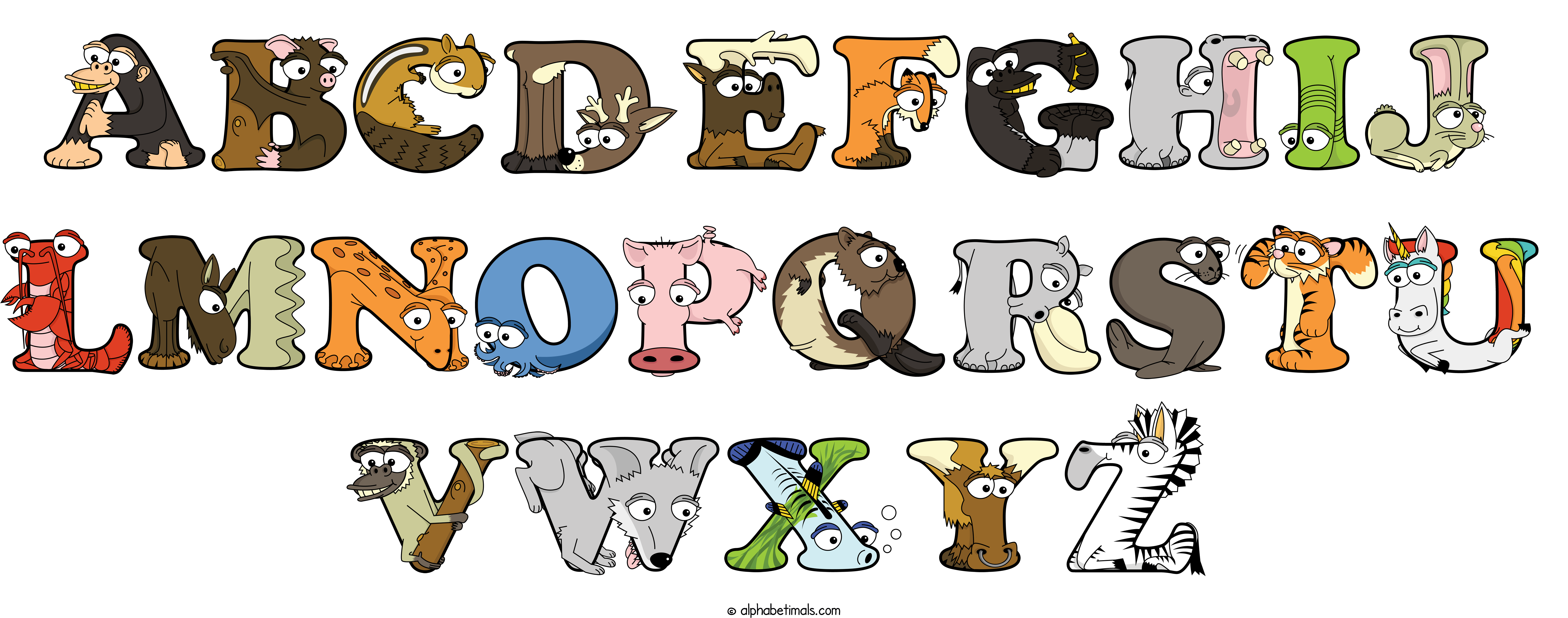 Kids have more fun and learn the ABC’s easier with Alphabetimals, cute cartoon animals shaped like the letters of the alphabet.